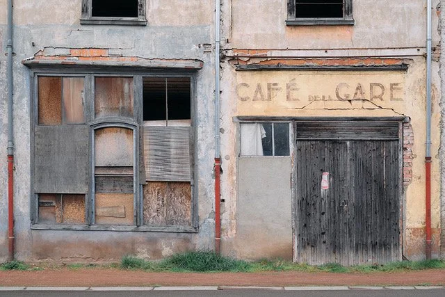 Thibaut Derien set out in search of the few remaining small shops, now abandoned, witnesses to a bygone era, a trade, a taste, a fashion. Deserted shops, left to the ravages of time, which he carefully selected from the multitude he encountered, for the unique emotion they evoked, and which inspired this ghost town, helplessly observing the bustle of impersonal shopping malls in the distance. Not so far away. These small shops populate Thibaut Derien's ghost town, forming a cemetery, a collection of traces, vestiges of a bygone era, swept away by industry, franchises, and the indifference of customers bewitched by the sirens of mass consumption and its temples of sheet metal and cinder blocks. In this cemetery of shops, the shutters are down, the doors sealed, the windows bricked up.